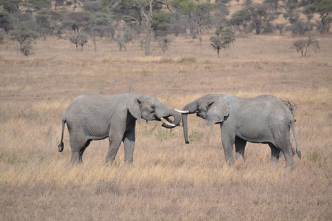 Les gazelles et antilopes dominent clairement d’un point de vue démographique. Vives et agiles elles font tourner en bourrique le roi de la savane. Ce surnom donné au lion est par ailleurs un peu prétentieux. En effet, cet impressionnant fauve musclé à la crinière fournie est un macho polygame. Il laisse chasser ses lionnes pour qu’elles lui ramènent un beau morceau de viande biologique. Une fois la panse remplie, le mâle dominant peut s’allonger sous un arbre et dormir jusqu’à quatorze heures par jour. Entre ses siestes, ce dernier passe son temps à s’accoupler jusqu’à cinquante fois en vingt-quatre heures. Quelle vie mes amis! Parmi les fauves, les guépards sont les plus frimeurs. Véritables athlètes avec leur silhouette élancée et leur poil tacheté, ils sont beaux et ils le savent. Un groupe de quatre nous offre un superbe défilé à quelques mètres de nous, en prenant bien le temps de se laisser photographier! Ces gros chats sont relativement inoffensifs pour l’homme, ce qui n’est pas le cas du léopard. Plus imposant, évitez de le taquiner sinon vous pourriez disparaitre en une bouchée. Les quelques massifs rocailleux leurs appartiennent, du haut desquels ces belles bêtes aux allures princières se prélassent en laissant leur progéniture se balancer dans les arbustes. Espèce différente mais tout aussi dangereuse, l’hippopotame raffole des plans d’eau ou des marécages boueux. Cette force de la nature prend un plaisir à s’entasser avec plusieurs dizaines de ses collègues pour prendre un bain prolongé, en lâchant des vagues successives de flatulences. Un concert atypique pour les oreilles, moins intéressant pour le nez ! L’éléphant est un animal impressionnant qui semble respirer la gentillesse. Attention toutefois, il a un caractère particulier en communauté. Comme d’autres espèces, un seul mâle dominant dirige la horde, les autres sont chassés et vivent dans des groupes de célibataires…jusqu’à ce que l’un deux fasse tomber le grand maitre. Et quand ils s’énervent, mieux vaut ne pas leur trainer dans les pattes comme nous le prouve cette bataille entre deux frères qui se donnent des coups de défenses. Un mot sur les marabouts, ces vautours grand format au long bec, qui posés sur la cime des arbres attendent que le châtiment funeste s’abatte sur leur prochain repas. Espérons que ce ne soit pas l’une de ces adorables antilopes naines surnommées dik-diks qui ne semblent pas être nées au bon endroit pour survivre.