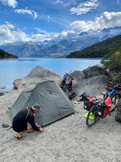 Un trajet en voiture ne prendrait qu’une poignée d’heures pour faire ce que nous faisons en plusieurs jours à vélo. Mais cette lenteur nous fait vivre une expérience totalement différente. La gestion de nos points de repos pour la nuit en est un bon exemple. Les villages étant assez espacés, nous devons trouver un emplacement où dormir parmi la flore. Les possibilités de bivouac sauvage ne sont pas si nombreuses qu’on pourrait le penser, la faute aux kilomètres de clôtures installées au bord de la piste traversant pourtant des terres peu peuplées. Nous plantons malgré tout la tente dans des endroits magiques. Sur une plage avec une vue imprenable sur des glaciers, au pied d’une cascade encerclés par la brume matinale ou encore au bord d’une rivière émeraude à déguster du saumon frais préparé par notre voisine chilienne. À l’inverse, nous passons des nuits moins tranquilles comme au bord de la route encaissée où nous subissons les vagues régulières de poussière, dans un poste d’attente pour traversier, dans un jardin privé aux ronfleurs affirmés ou encore dans des campings municipaux bondés.